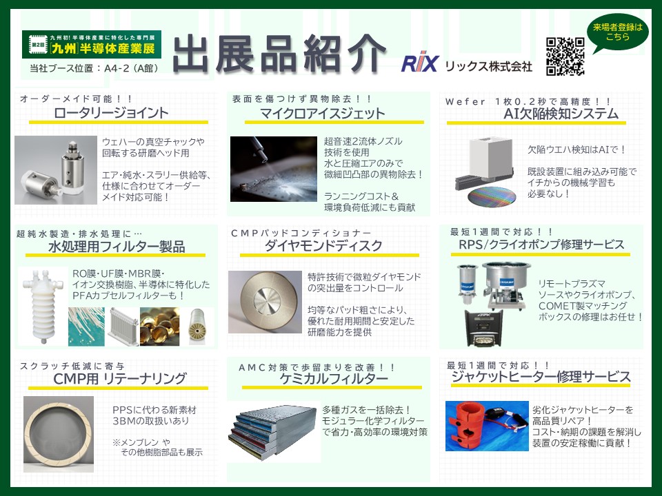 当社は、2025年10月8,9日に開催される「第2回 九州半導体産業展」にブース出展します。同展示会は、半導体製造に関する各種製品・商品・サービスが一堂に集まります。当社は"メーカー商社"として自社製品はもちろん、お客様の困りごとを解決できる幅広い製品群をご紹介します。ぜひお立ち寄り頂けますと幸いです。