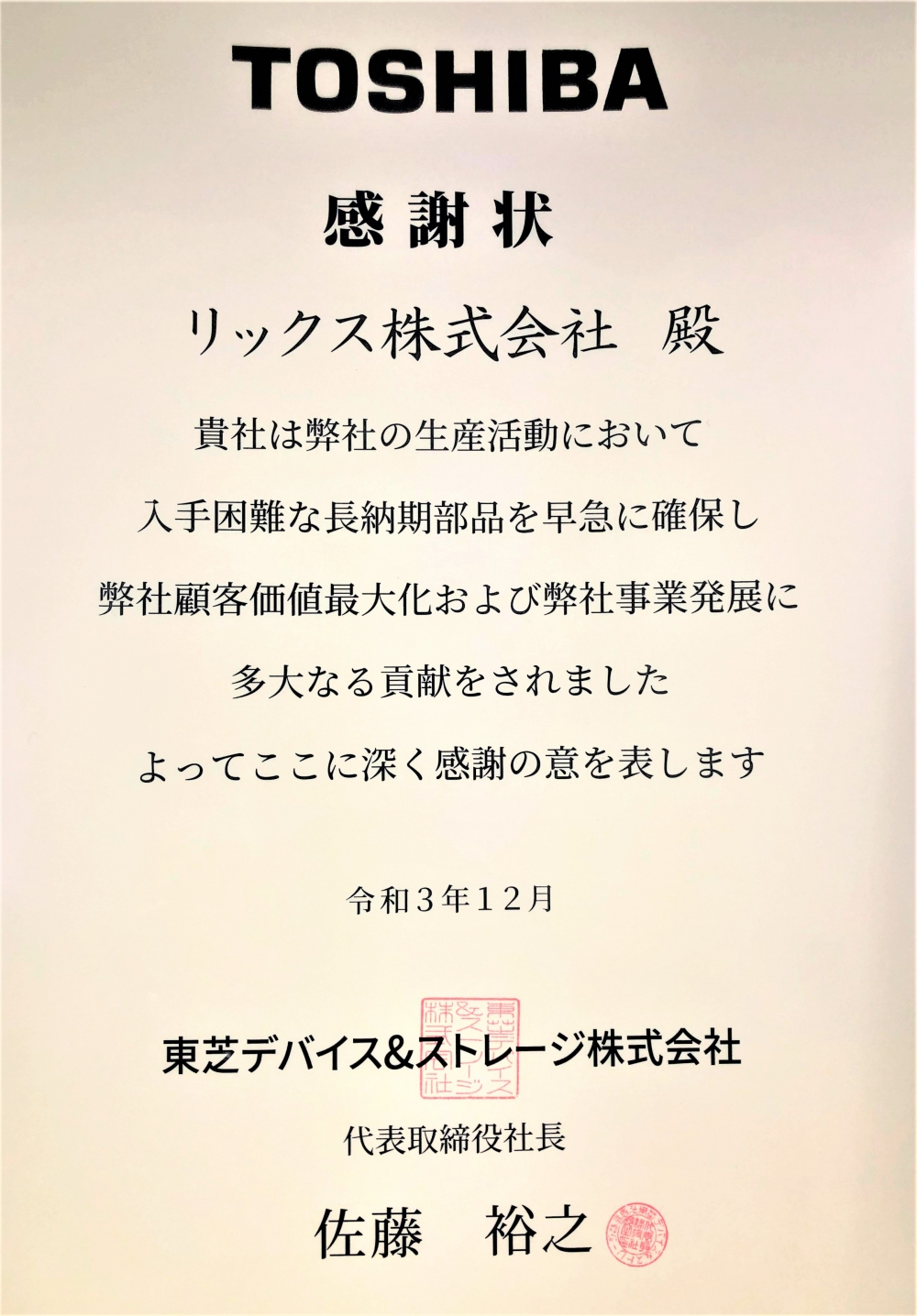 東芝デバイス&ストレージ様より感謝状を贈呈頂きました。