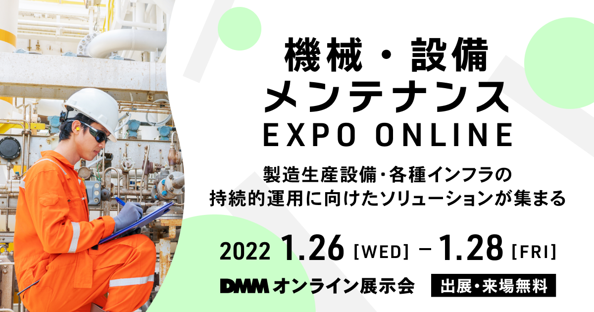 当社は2022年1月26日(水)〜28日(金)に、合同会社DMM.comが主催するオンライン展示会『機械・設備メンテナンスEXPO~製造生産設備・各種インフラの持続的運用に向けたソリューションが集まる~』に出展いたします。