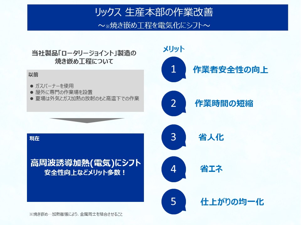 当社生産本部の作業改善に関する取り組みについて、熱産ヒート様(福岡県北九州市)のHPに記事を掲載頂きました。これまで、当社製品「ロータリージョイント」を製造する際、焼き嵌めの工程でガスバーナーを用いていました。ただこの度、作業者の安全性向上や省エネ化を見据え、熱産ヒート様の「高周波誘導加熱」(電気)にシフトしました。
