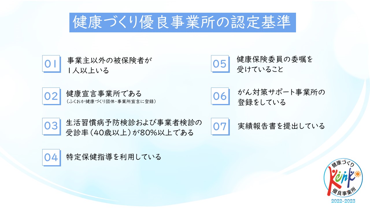 当社はこの度、全国健康保険協会(福岡支部)の取り組みである「令和5年度 健康づくり優良事業所」の認定企業となりました。従業員の健康維持や促進に努めた企業を全国健康保険協会(各県支部)が認定するもので、下図で示した7項目が認定基準です。