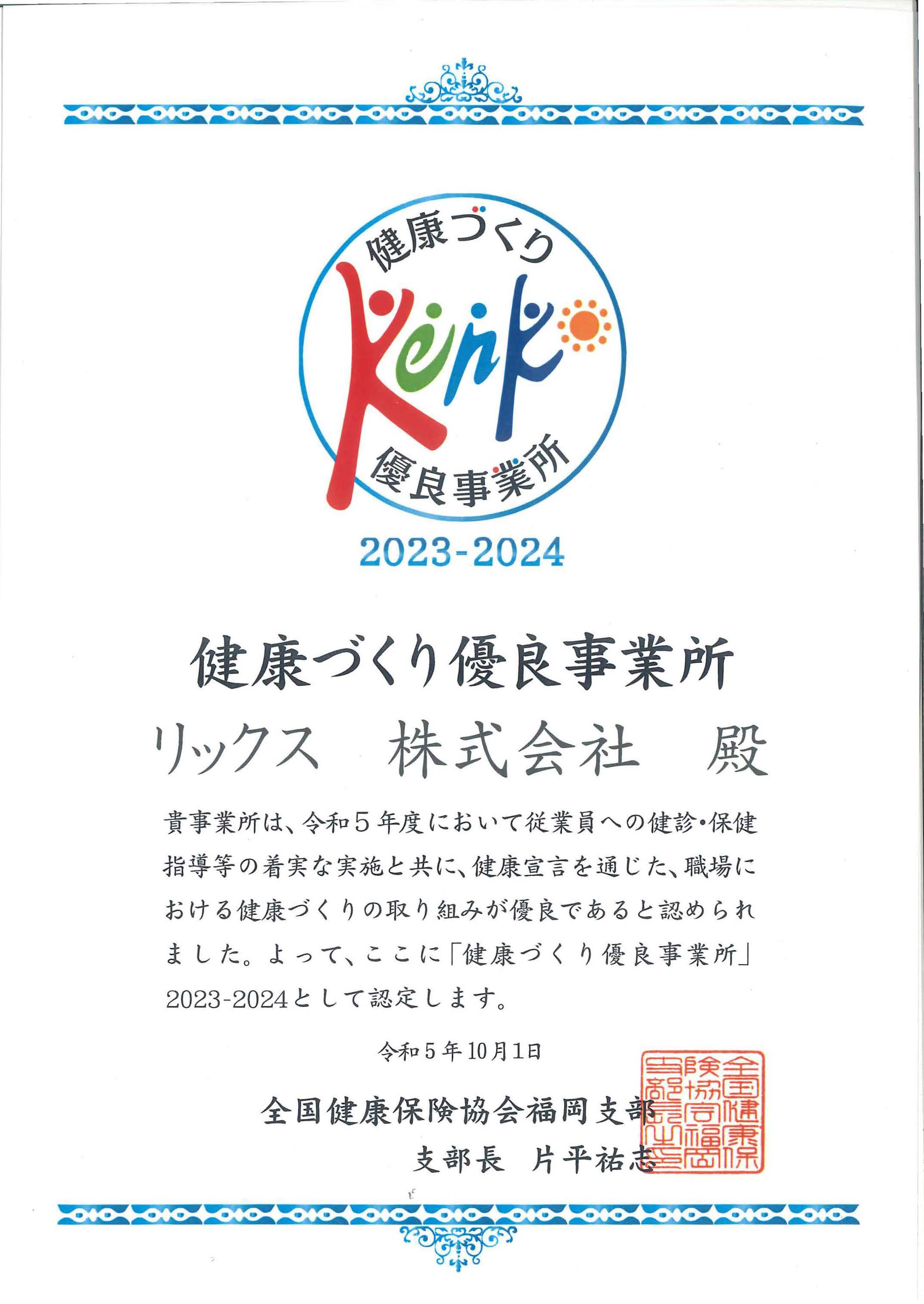 当社が「令和5年度 健康づくり優良事業所」に認定されました。