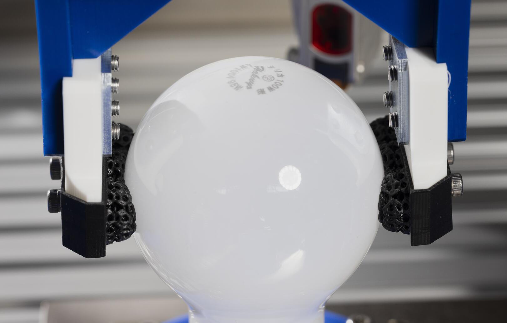 柔軟指は、3Dプリンターで作ったラティス構造の樹脂に柔軟性を持たせたロボットハンドツールです。ロボットなどのチャックツメに柔軟指を取り付けることで、指で優しく包み込むように対象物を安定して掴むことが可能です。様々な形状を掴むことができるため、「ツールチェンジ(段取り換え)」の工数削減を実現できます。