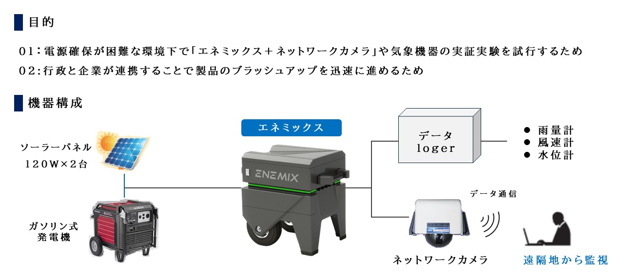 近年、災害が激甚化しており、自治体をはじめとする団体は、監視用途によるネットワークカメラやその他電子機器の導入の検討を進められています。しかし、河川付近など監視したい場所では、カメラや電子機器を動かすための電源確保が困難な場合が多い状況です。現状、主に使用されている太陽光発電では、雨天時や夜間など、非日照時に電源不足となることがあり、天候に左右されず安定した電源を供給できるシステム構築が求められていました。