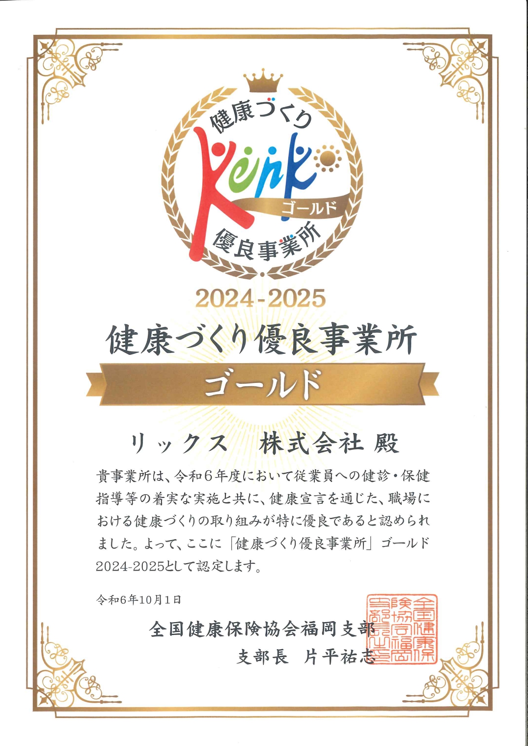 当社は「令和6年度 健康づくり優良事業所 ゴールド」の認定を受けました。