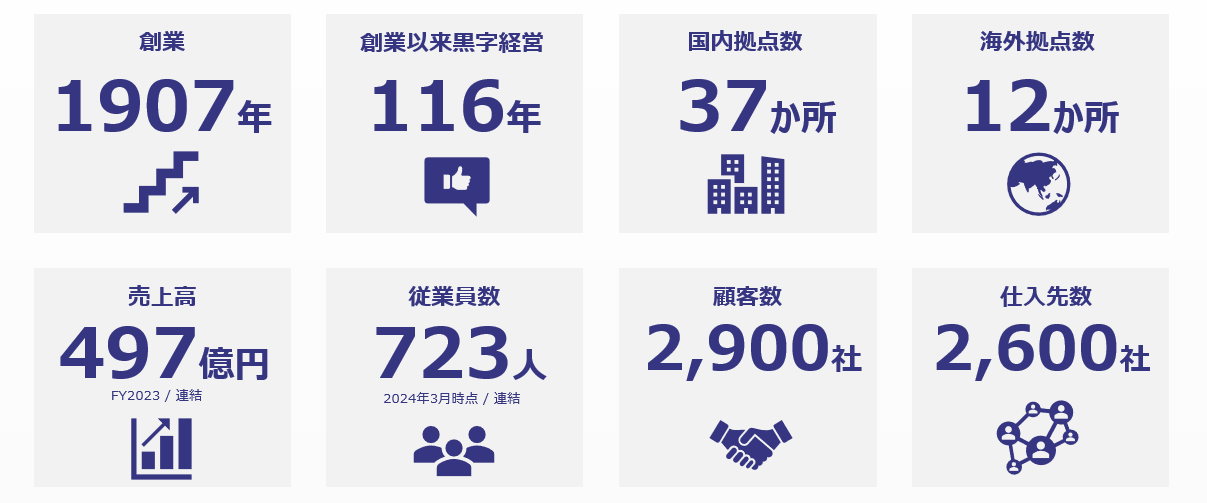 当社は創業1907年明治40年に創業し今年で117年を迎える”メーカー商社”です。機械商社として、鉄鋼・自動車・半導体など、日本の基幹産業である製造業をお客様とし、生産ラインに欠かせない製品や商品・サービスを提供する「縁の下の力持ち」のような会社です。![]()