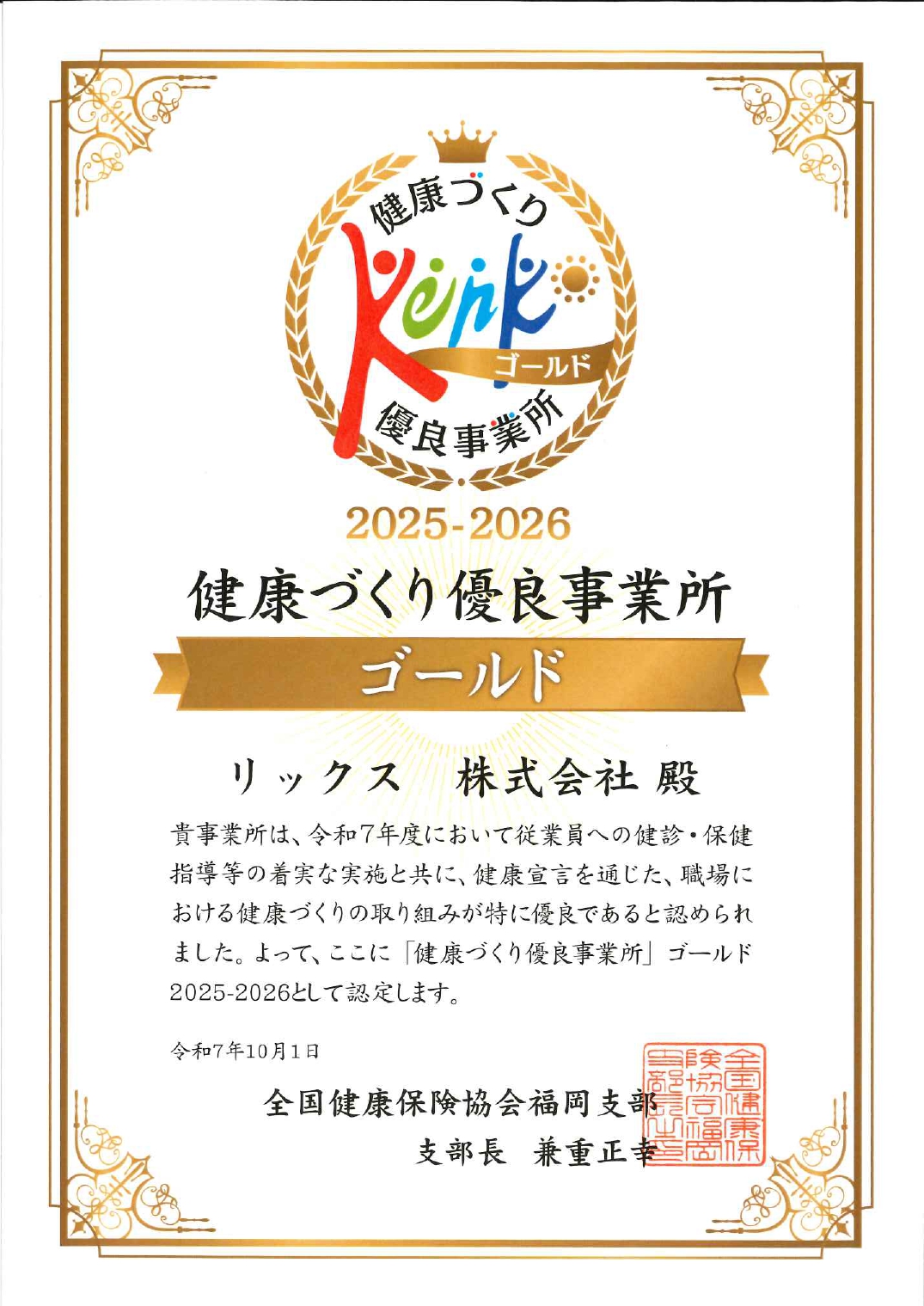 当社は「令和7年度 健康づくり優良事業所 ゴールド」の認定を受けました。