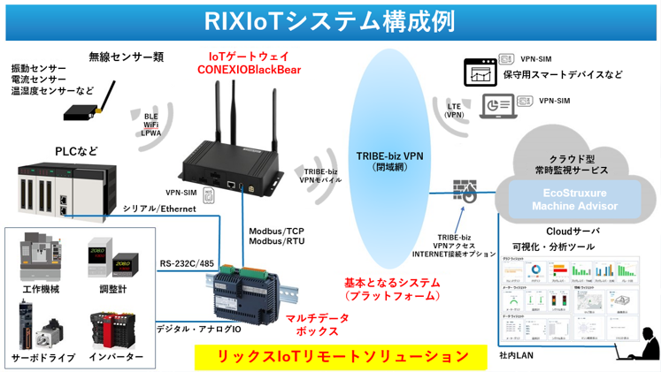 RIXIoTは当社がご提供するIoTリモートソリューションのことです。製造現場の生産設備・モータ・ポンプ・センサー等を一元監視することで、運用保守や現場作業員削減を実現できます。また、取得データを活用した傾向監視や製品開発も可能です。