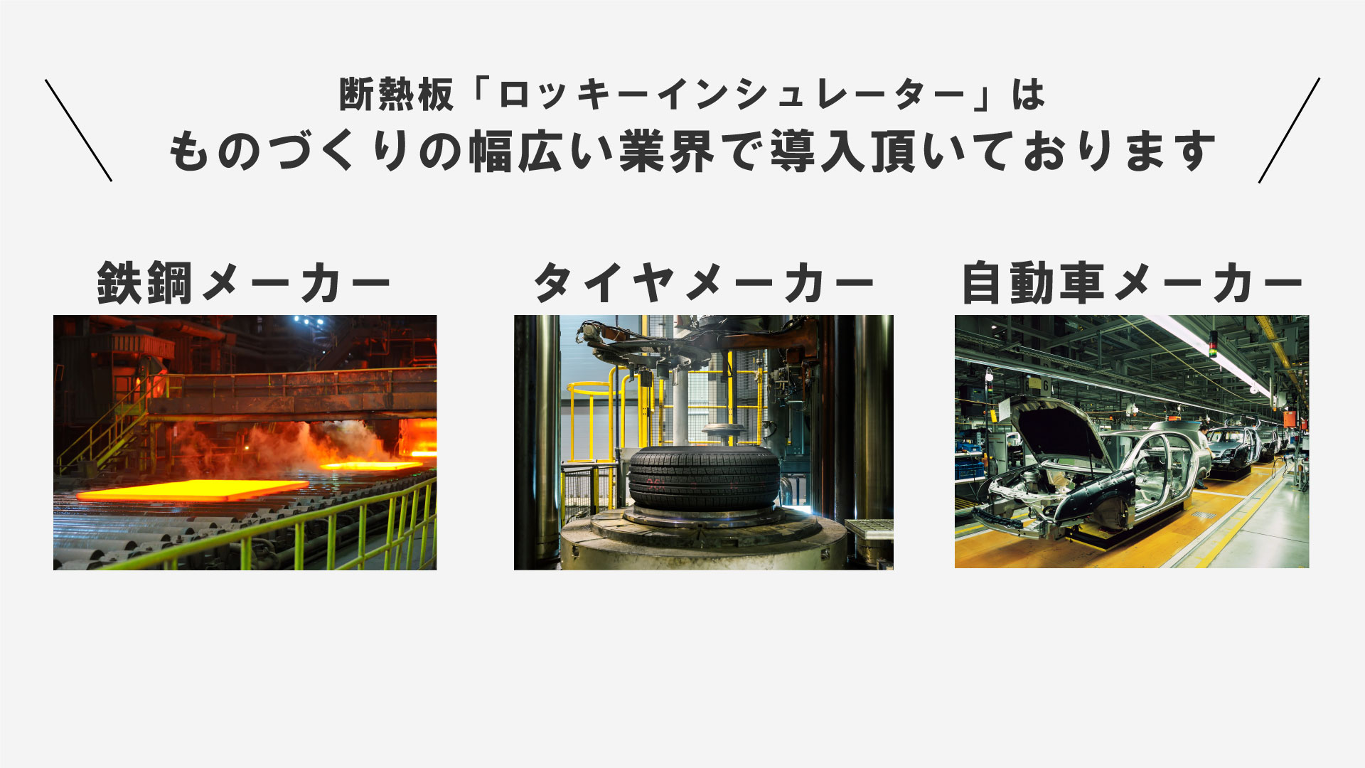 ロッキーインシュレーターは大手鉄鋼メーカー、大手自動車メーカーなど様々な業界の生産設備でご利用頂いております。中でもタイヤ製造設備である「加硫機「プラテン用断熱板」や「油圧シリンダーの保護用断熱板」としては、国内外のタイヤメーカーに導入実績がございます。また、保温材や絶縁材としても採用いただいております。