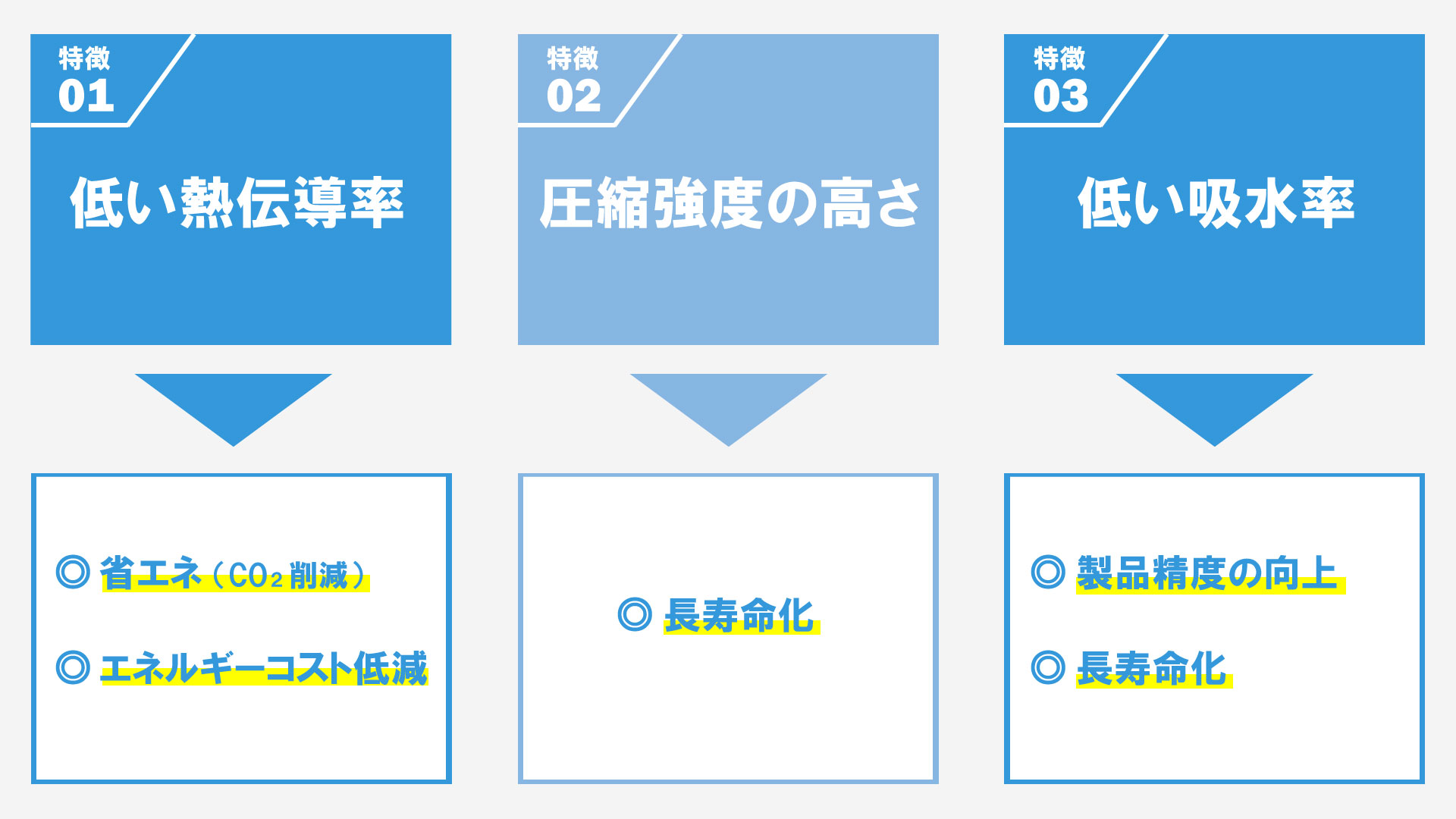 ロッキーインシュレーターは成型機で加熱・直圧一体成型しているため、積層タイプの断熱材に比べ「吸水率」が低いことが特徴です。そのため破損が少なく、長くご使用頂けるので、設備保全費のコストダウンにつながります。
